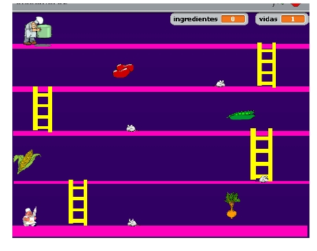 Aquí aparece un ejemplo de un juego en el que nuestro cocinero tendrá que conseguir una serie de alimentos a lo largo del recorrido. Luego de ello lo que hará será que contestar una pregunta que tenga que ver con la temática.